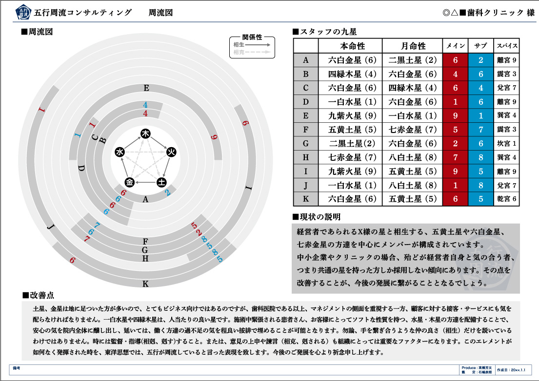 具体的には、スタッフ個人の誕生日の星を陰陽五行の「木・火・土・金・水」の五つに分類し、五行周流図に落とし込みます。その分布具合から組織の偏りを分析します。
