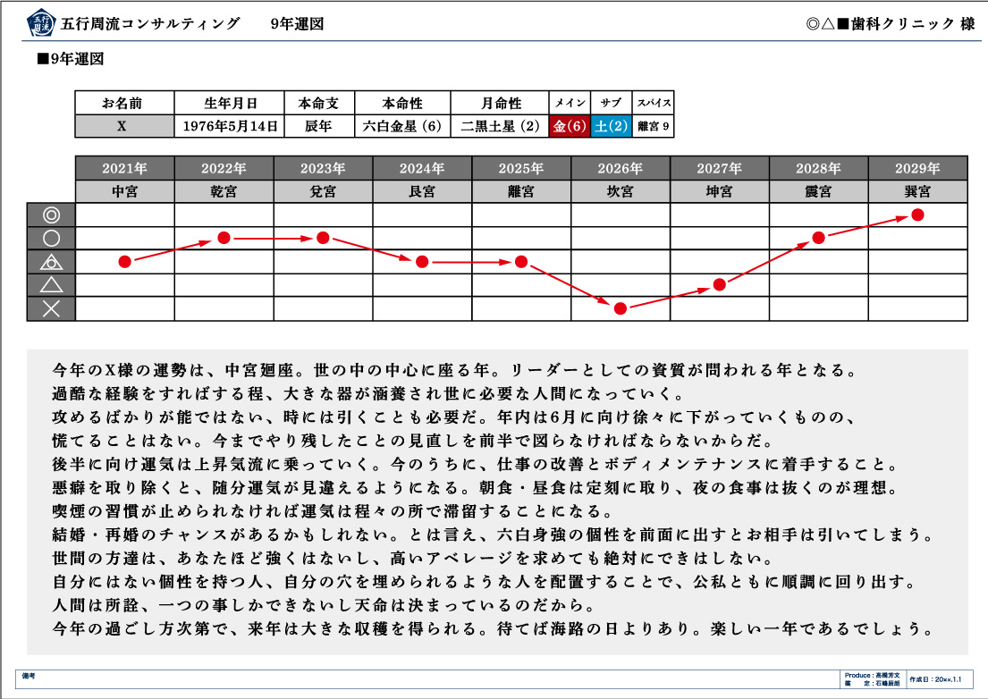 また同時に経営者様ご自身の長い期間の運気のバイオリズムが見られる九年運図も作成し、お渡しいたします。
